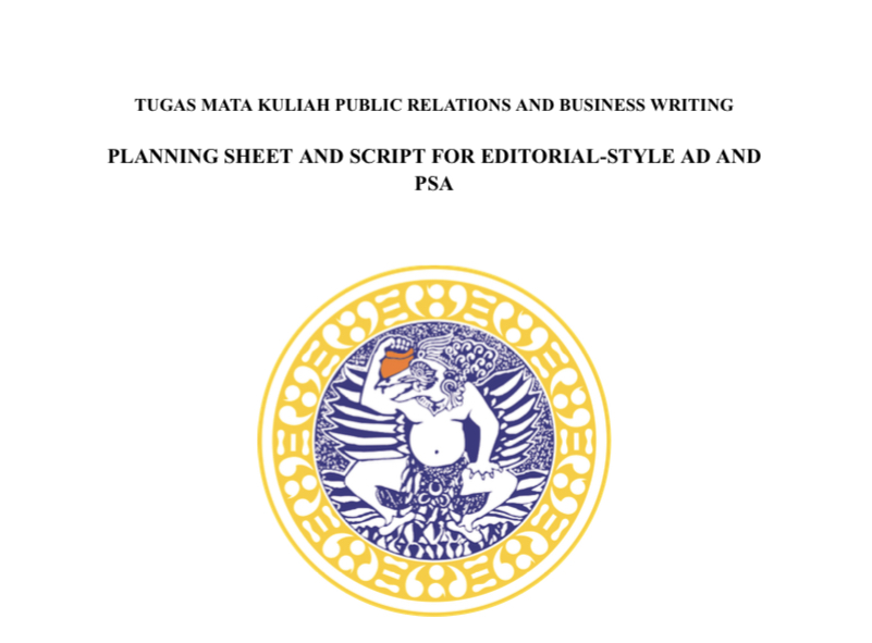 Karya ini merupakan tugas mata kuliah Public Relations and Business Writing yang menyusun strategi komunikasi strategis berupa Planning Sheet dan naskah (script) untuk dua format publikasi: Editorial-Style Ad (Iklan Gaya Editorial) dan Public Service Announcement atau PSA (Iklan Layanan Masyarakat). Materi ini difokuskan pada optimalisasi layanan UNAIR Help Center sebagai ruang aman bagi mahasiswa dalam menjaga kesejahteraan mental di lingkungan akademis.